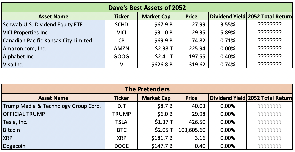 So I’m throwing down the gauntlet. I’m putting up my best stocks of 2052 vs. your beloved tokens and hype picks. All my stocks are real companies that I own and have detailed on here. In 27 years, we’ll meet back up and see who had a higher total return.