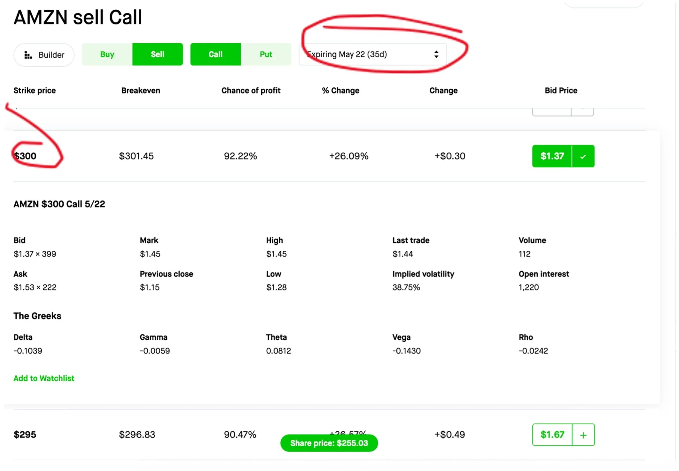 If AMZN is A, trading above $300 on May 22, the stock would have moved up 18%, and your option would be sold for about 30%.