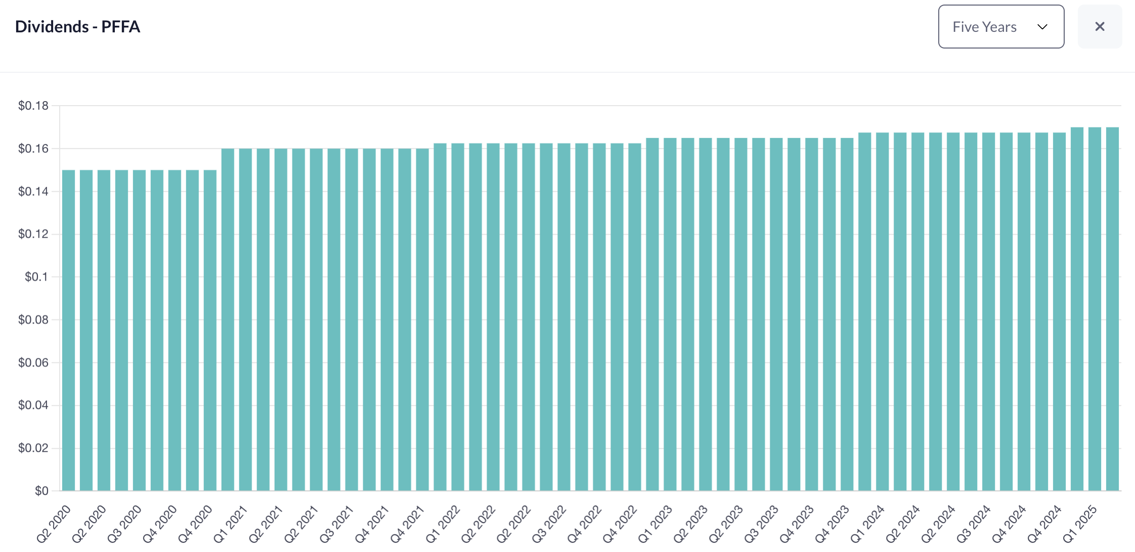 PFFA is a fund that is an index of 181 different companies’ preferred stock. They get the dividend payments, take a cut, then pay the rest out to you.