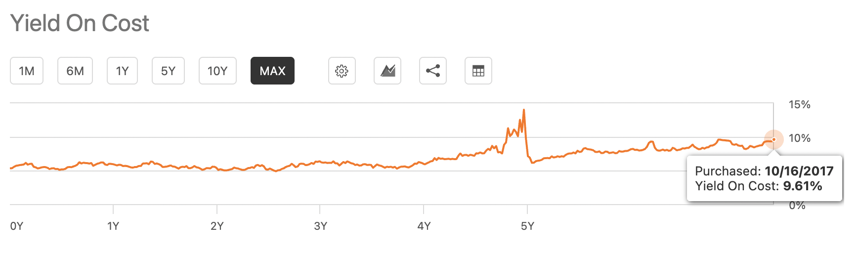 But the ‘yield on cost’ from ten years ago? Well, that is over 18%!