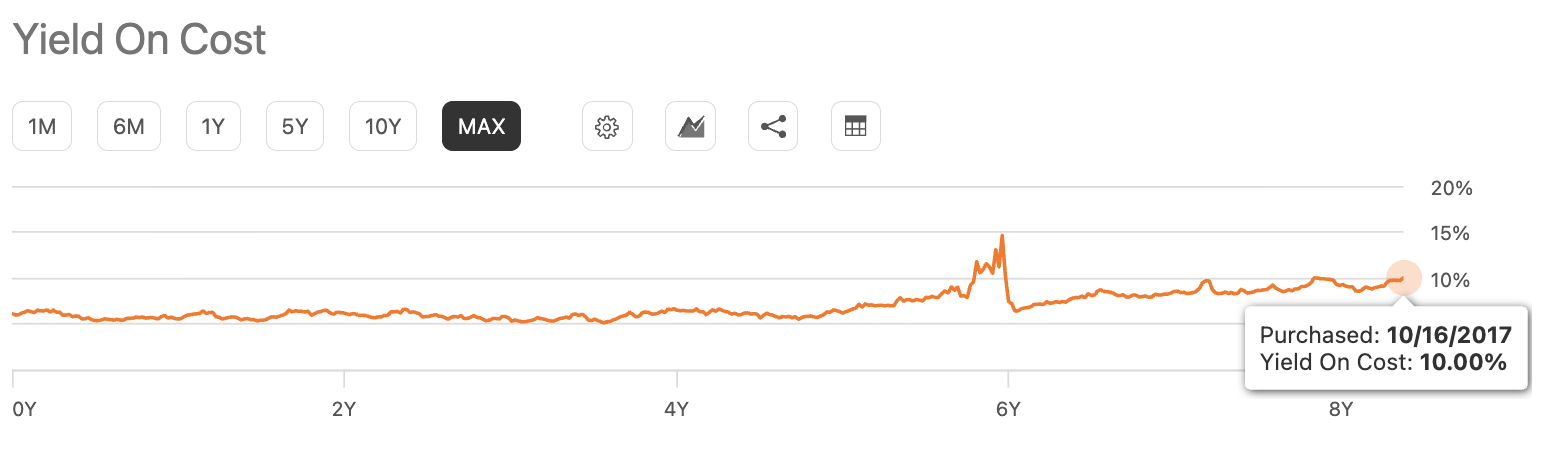 But the ‘yield on cost’ from ten years ago? Well, that is over 17%!